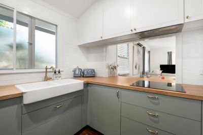 - Newly renovated kitchen featuring an integrated dishwasher, stunning cabinetry, Butler sink and timber benchtops