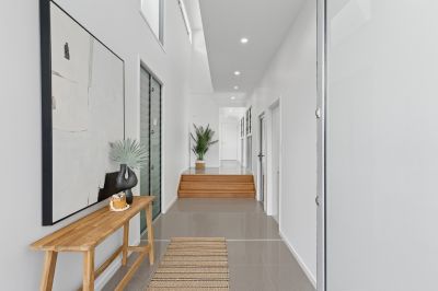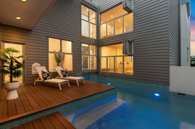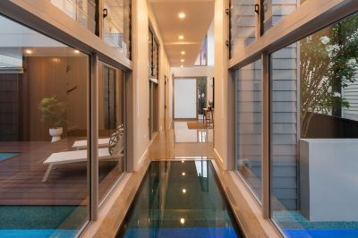 This Manly terrace home seamlessly combines a glass-wrapped, pavilion-style design with a central pool. North facing, offering views of Moreton Bay and the surrounding islands. The home balances open living spaces with private retreats, featuring two wings: one with an ocean-facing deck, main lounge, and family quarters, and the other with a luxurious master suite, complete with a walk-in robe, ensuite, and nursery/retreat. Just steps from the waterfront and Manly Village, the standout feature is the third floor entertainment lounge with glass bi-folds capturing the panoramic views in all their glory.