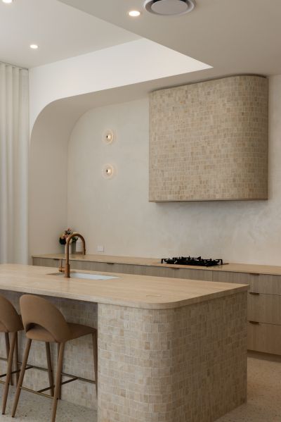 - Covered alfresco with travertine crazy paving, outdoor kitchen and BBQ